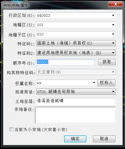 ① F 表示房屋等建筑物、构筑物; L 表示森林或林木; Q 表示其他类型的定着物; W 表示无定着物。宗地的构筑物特征码自然是默认W,当绘制定着物填写属性时,构筑物特征码则可以选择。