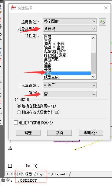 在命令行输入qselect,回车,按下图对话框设置选择条件,点击“确定”,即可批量选择未闭合的复合线。
