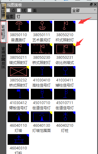 右上角有带颜色的扇形,用来区分地物实体类型,蓝色表示点状地物符号和注记,红色表示线状地物符号,黄色表示面状地物符号。
