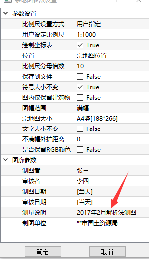 请检查输出宗地图的对话框中,是否设置测量说明测量说明,下图所示