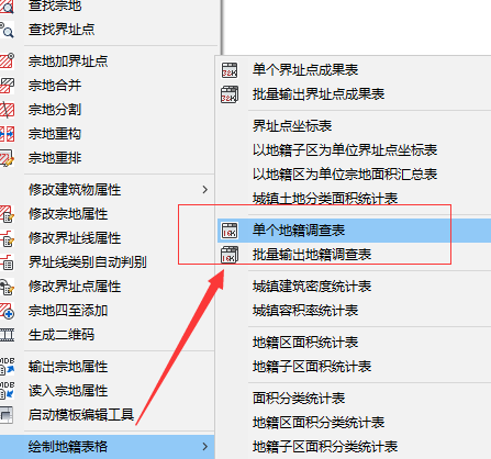 请点击菜单“地籍-地籍表格”下图所示的菜单,即可完成输出。