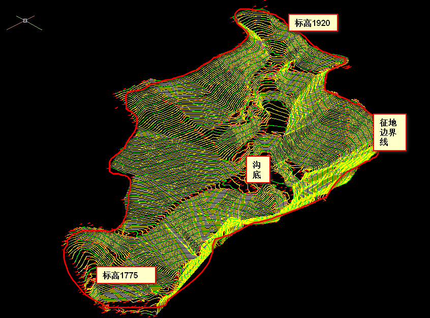 计算征地线内可以排图量,标高1775向上以1:1的坡度到1920,如何绘制上境界线,(知道范围,如何向上放坡,指定标高和坡度)