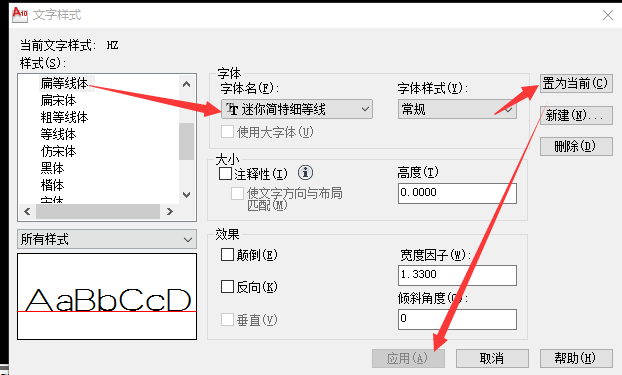 在命令行输入style,在下图界面中,选择相应的字体,点击“置为当前”后,点击“应用”