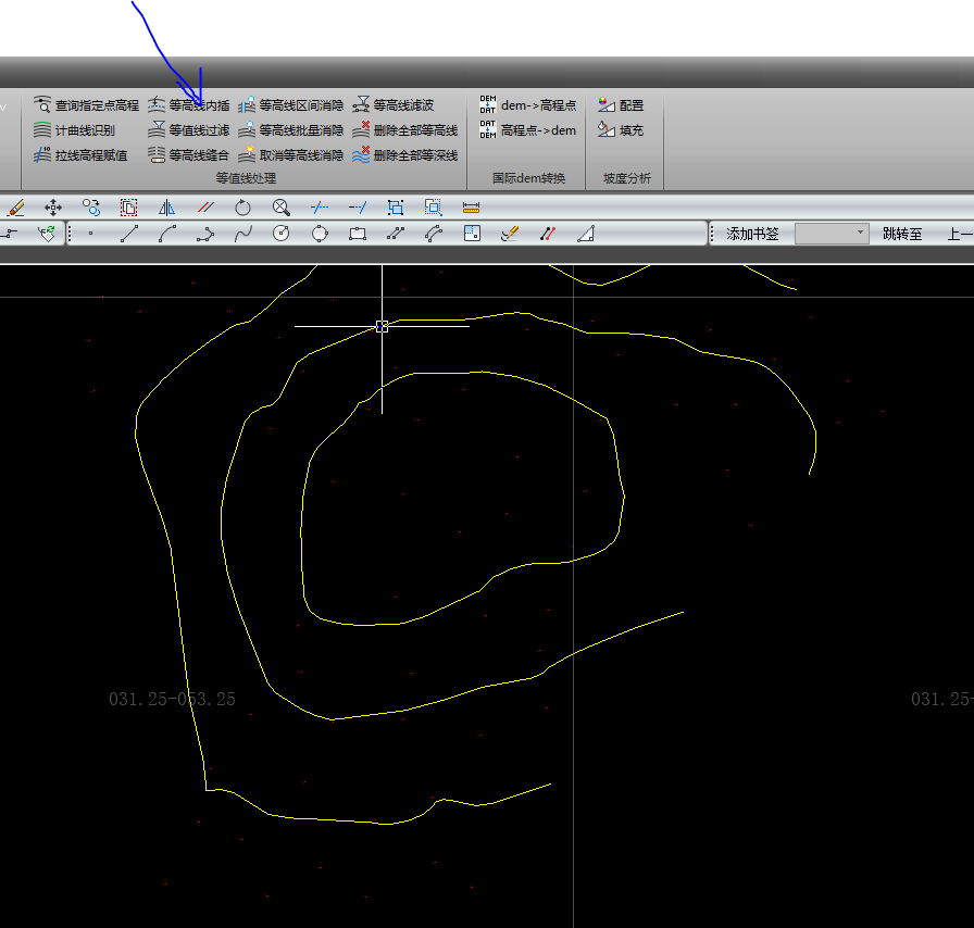 按照提示语句,完成绘制想要内插等高线的范围的左右边界,然后就可以自动在范围内内插了